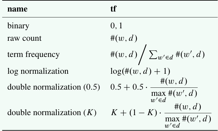 \[\mathrm{tf}_{w,d} = \mathrm{count}(w,d).\]Besides counting, there are other calculations (Table 2). Among them, the most common practice is to take $\log_{10}$ of the raw count